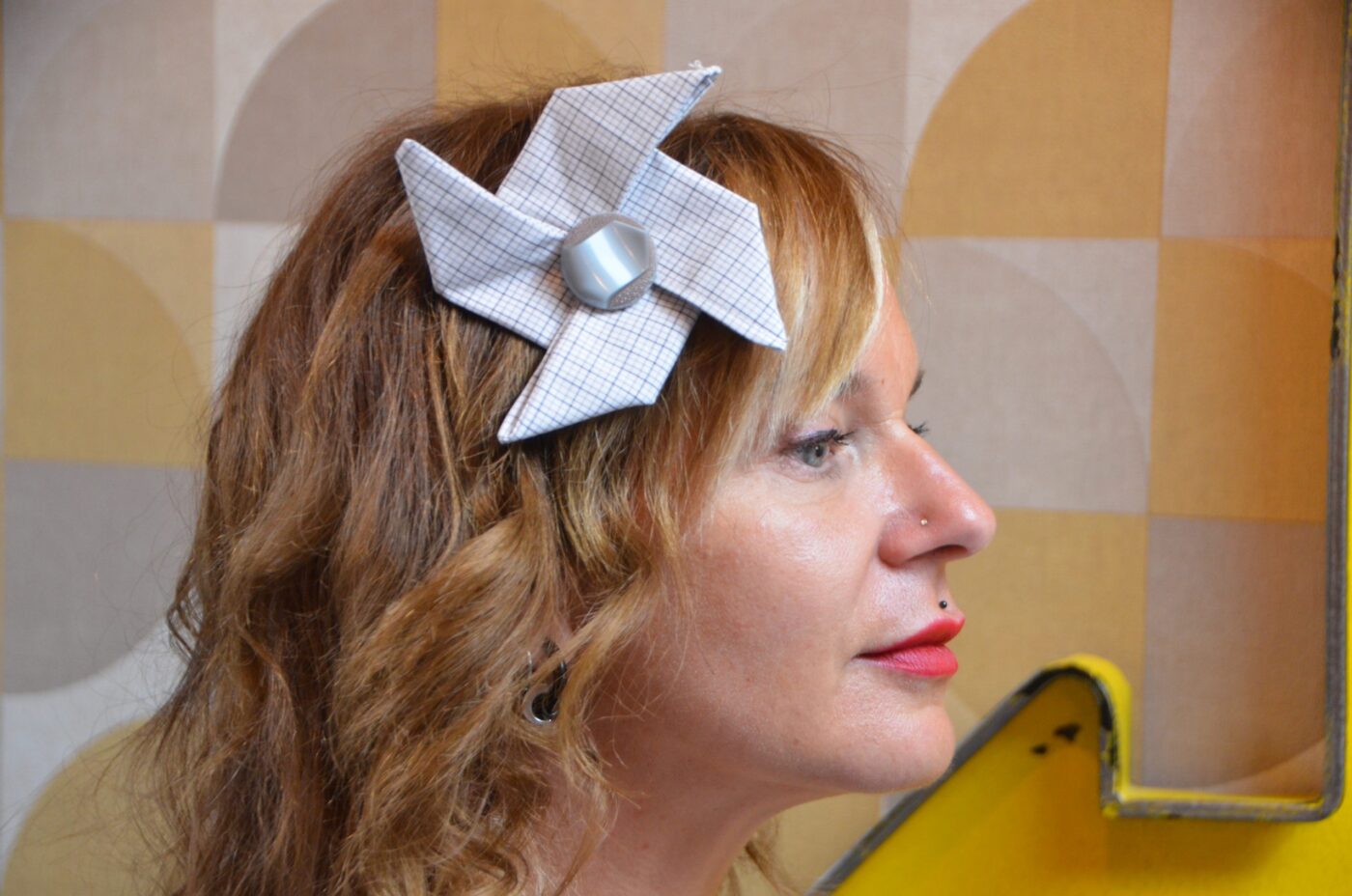 Grande pince à cheveux pinette en coton fait avec de la recup de chemise d’homme. Gros bouton gris en plastique.